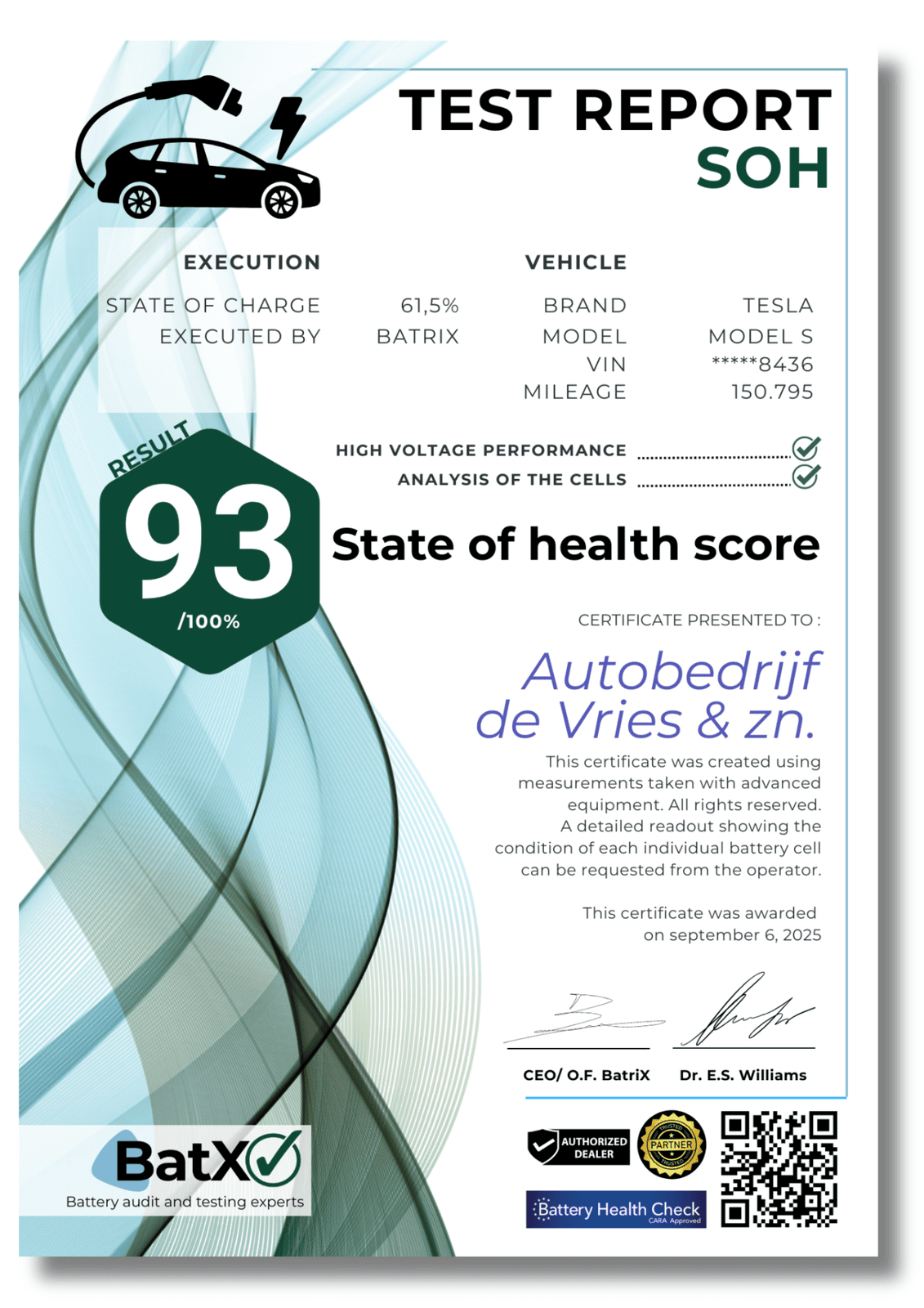 “Sinds we de accutesten van BatX gebruiken, verloopt elke EV-verkoop soepeler. Kopers hebben direct vertrouwen zodra ze het certificaat zien. Minder vragen, snellere deals én hogere inruilwaarde. Voor die drie tientjes per test is dit echt een no-brainer.”