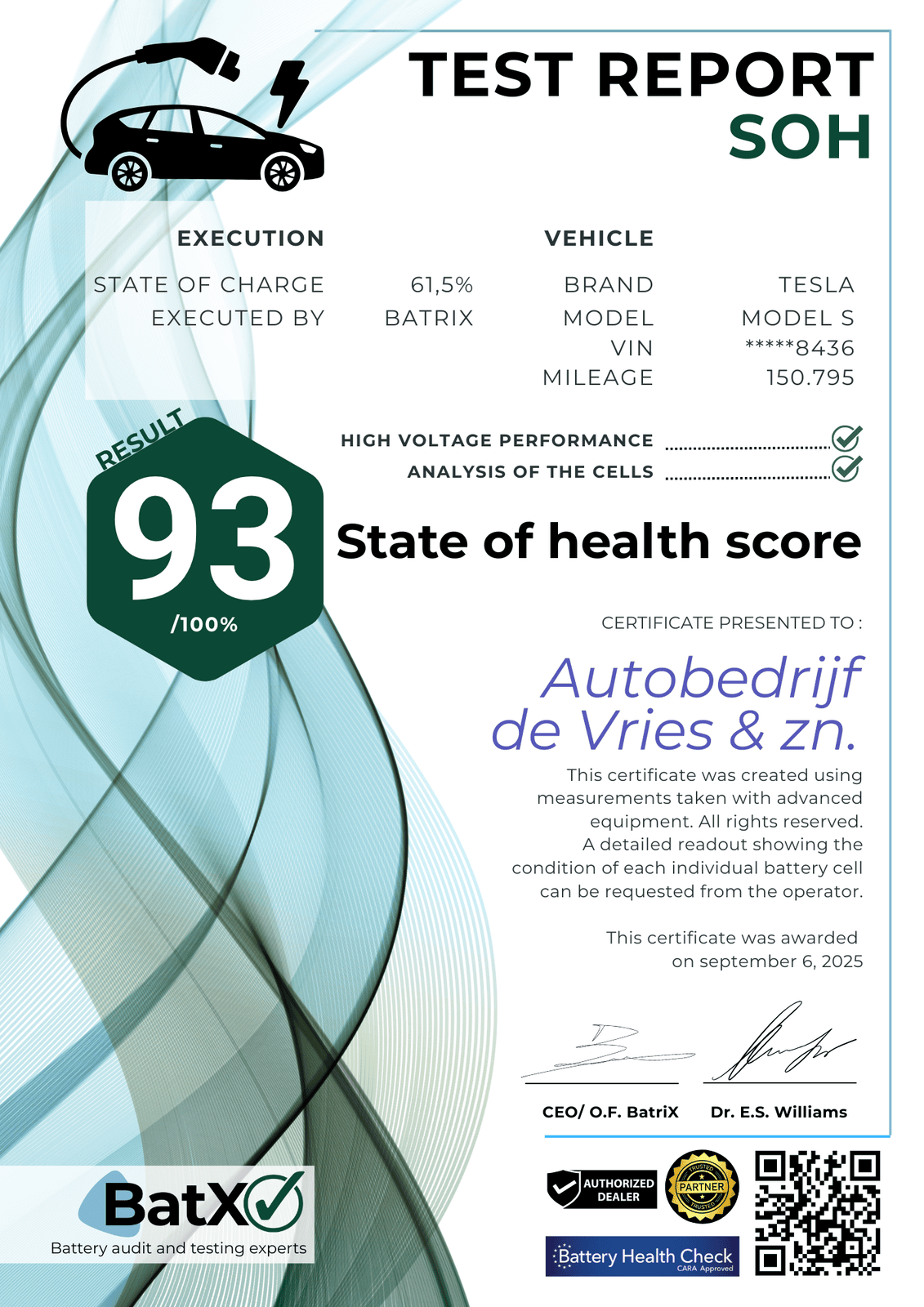 “Onlangs heb ik mijn elektrische auto laten onderwerpen aan een accutest bij BatX, en ik moet zeggen: het was een buitengewoon aangename ervaring. De medewerkers zijn kundig en nemen de tijd om alles helder toe te lichten. Het ontvangen certificaat stelde mij zeer gerust; het is prettig om exact te weten dat de accu in uitstekende conditie verkeert. Ik kan BatX van harte aanbevelen..”