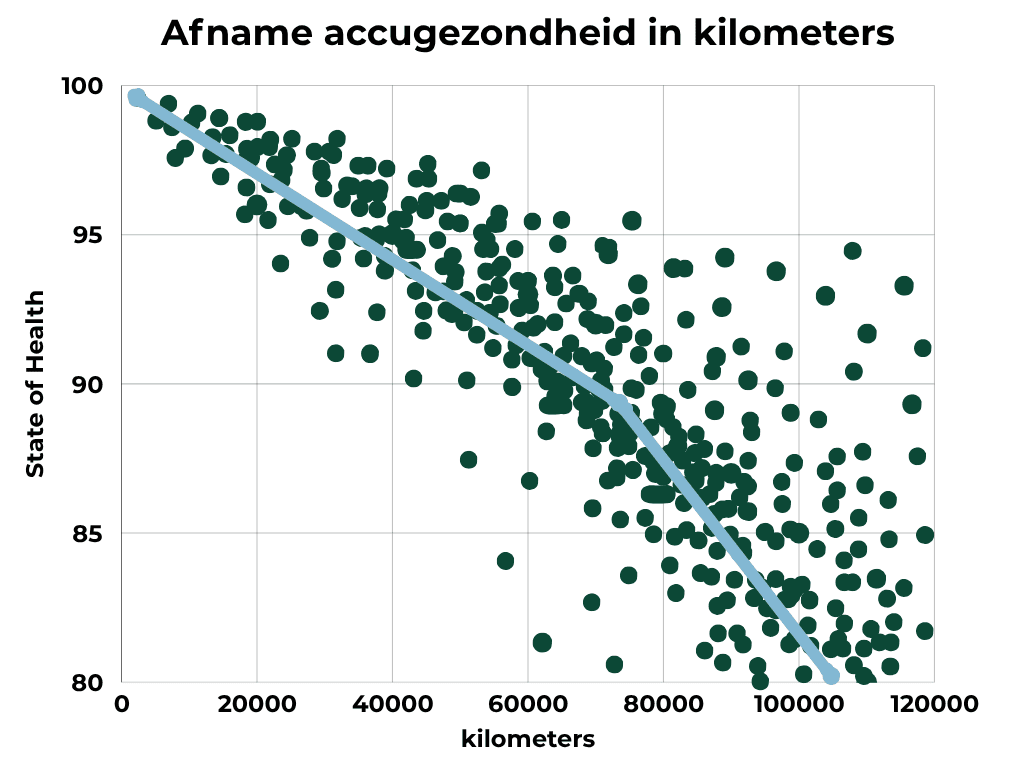 Een accutest is essentieel om te begrijpen hoe jouw EV-accu er écht voor staat. De grafiek hiernaast laat mooi zien hoe de capaciteit langzaam daalt naarmate je meer kilometers maakt. Door dit regelmatig te meten, voorkom je verrassingen, en weet je precies hoeveel actieradius je nog kunt verwachten. Zo blijf je zorgeloos rijden.